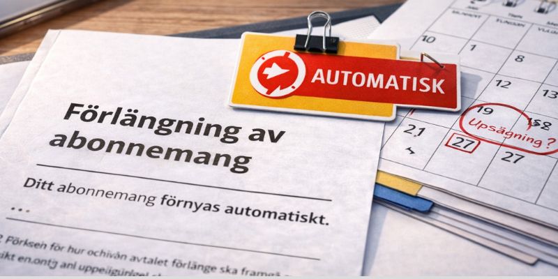 Automatisk förlängning är vanligt förekommande vid abonnemang för exempelvis mobiltelefoni, streamingtjänster, gymmedlemskap och olika digitala tjänster. Det innebär att avtalet fortsätter att gälla om…